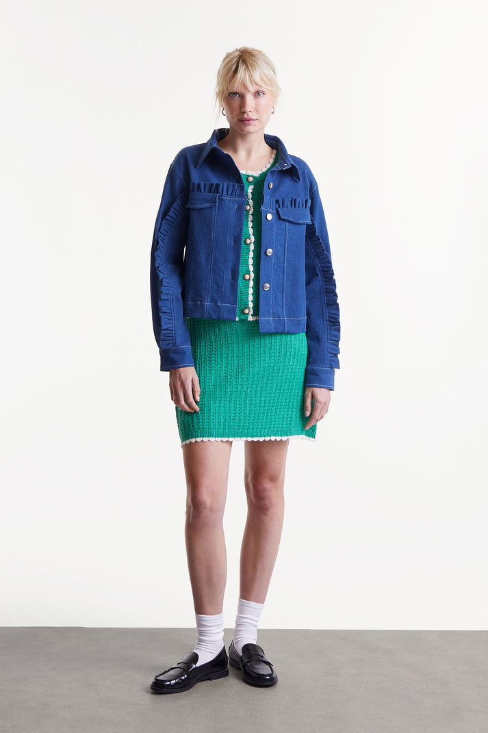 Giacca in denim elasticizzato con dettagli volant. Chiusura frontale con bottoni. Tasche anteriori applicate.